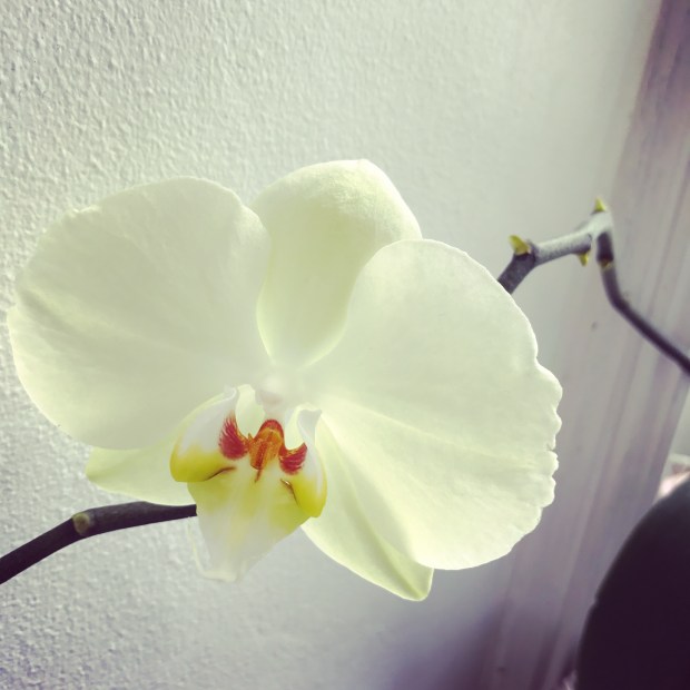 Another rescue orchid. This time let me introduce you to livingroom orchid. She has bloomed for the first time since coming into the home last April. Beautiful. Also, behind her, outside, that’s our little putt-putt.