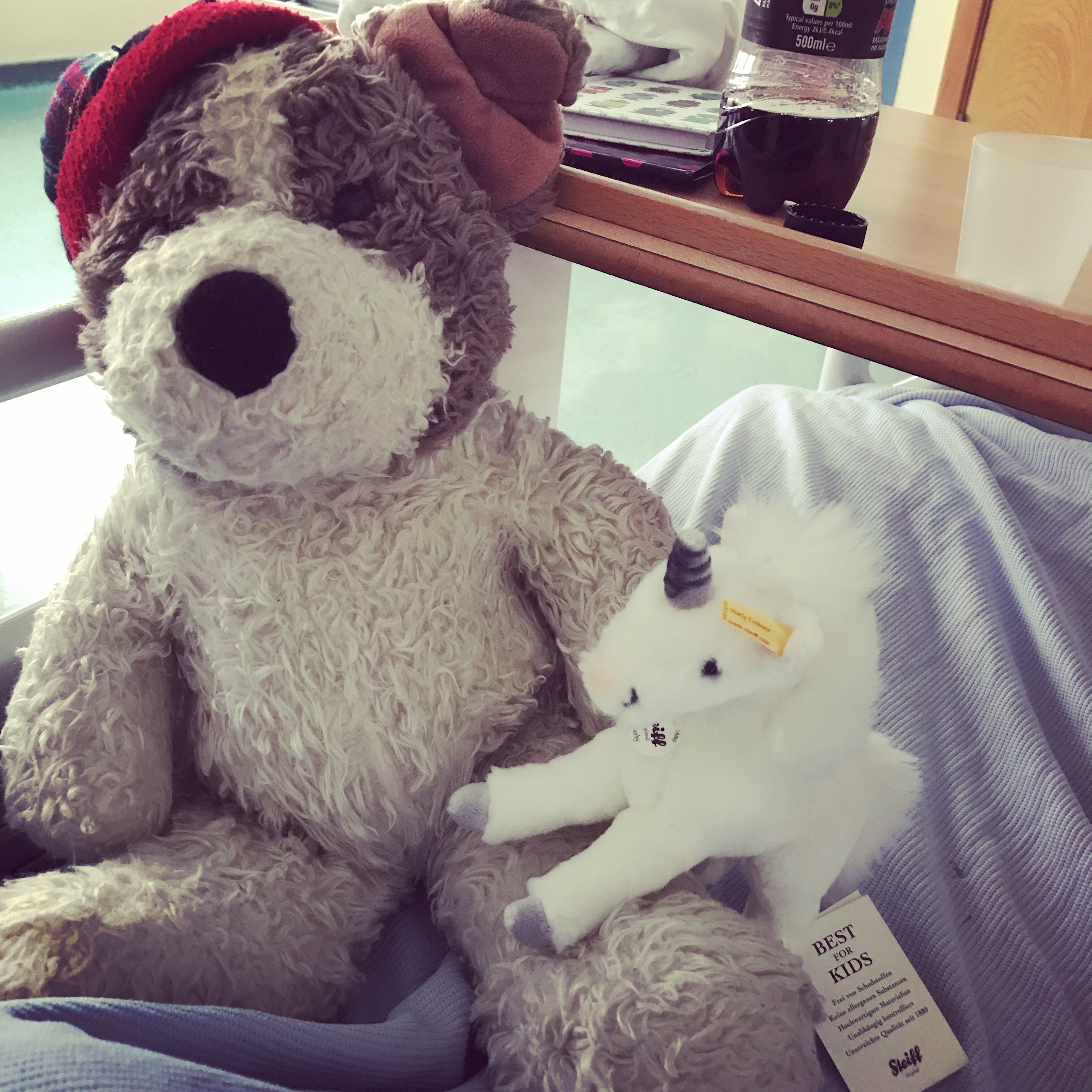 The bear on the left is Ted. Ted is my oldest teddy bear. He’s been to lots of hospitals, on holiday, to sleepovers… basically, anything you can think of he’s going with me. The little unicorn on the right is a new addition to the family. What should I call her?