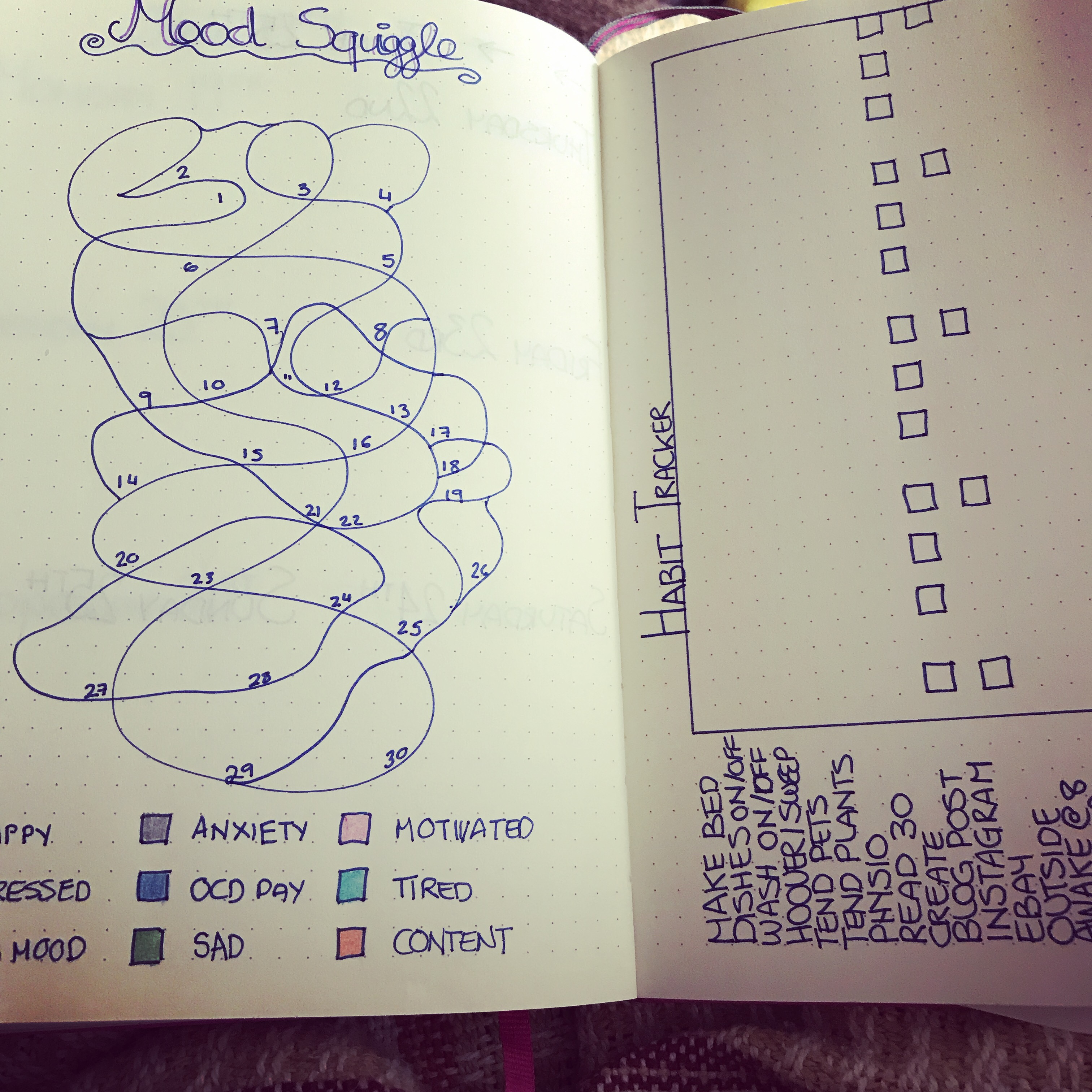 Doing something a little different this month with my mood tracker. This month is a mood squiggle. And, of course, the ever trusty habit tracker.