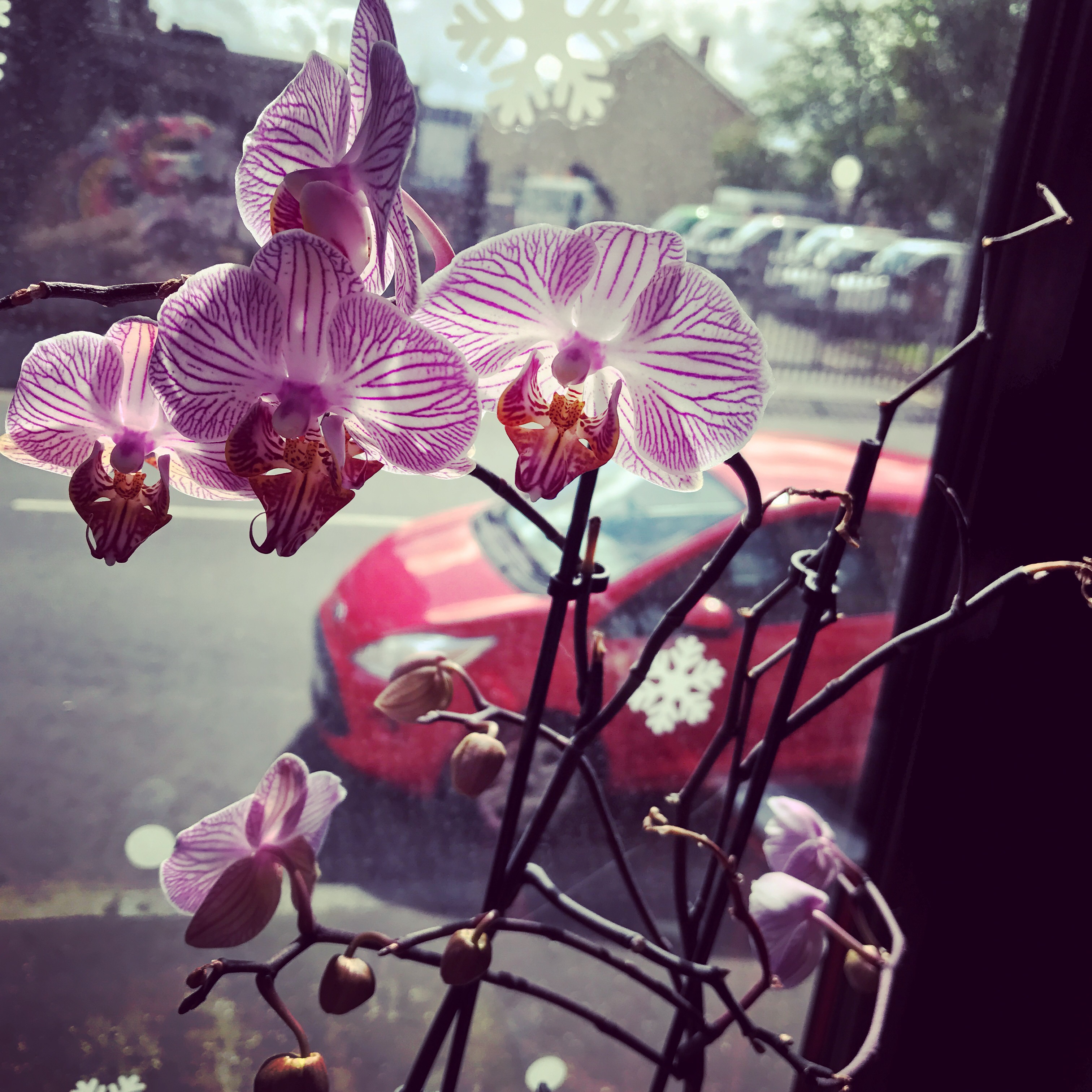 Another rescue orchid. This time let me introduce you to livingroom orchid. She has bloomed for the first time since coming into the home last April. Beautiful. Also, behind her, outside, that’s our little putt-putt.